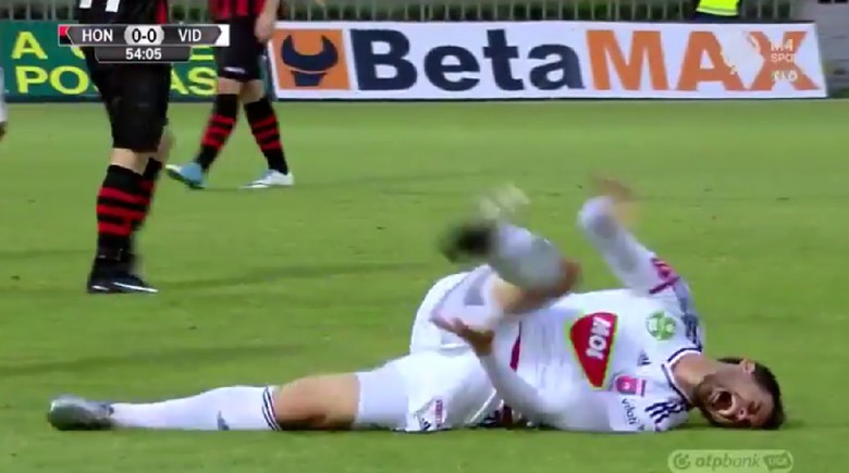 Aksi diving seorang pesepakbola di liga Hongaria jadi viral. Bagaimana tidak, sudah jatuh ke lapangan pun ia pun masih heboh jumpalitan dengan lebay!